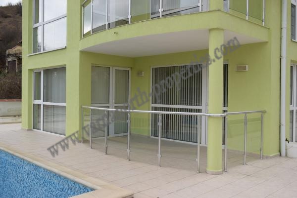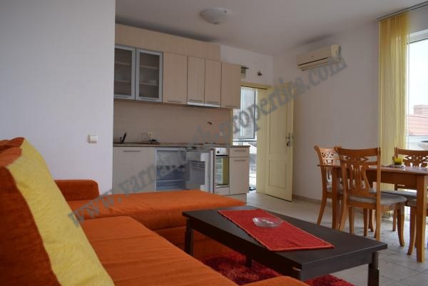 The apartment consists of a spacious living room with a kitchenette, a bedroom, a large and a smaller terrace, two bathrooms with a toilet, air conditioning. In the courtyard of the apartment block, there is a swimming pool, which is used by all living in it. The property is being sold furnished and equipped with everything necessary for a household. It is located in the area of ’Ovcharovski Plaj’ The block of apartments is located 600 meters from the main road, 3 km from Balchik and 8 km from Albena resort.